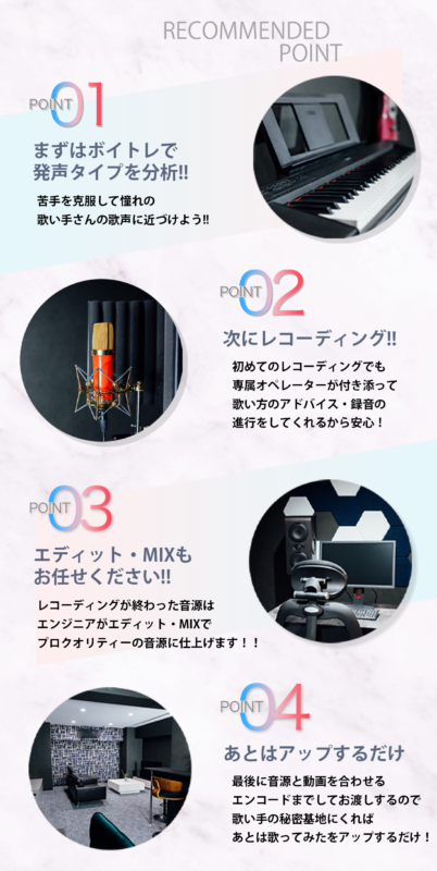 - 専属オペレーターが必ず1人付き添い、レコーディングを進行させていただきますのでご安心ください。ご要望いただきましたら歌い方のアドバイス等もさせていただきます!!