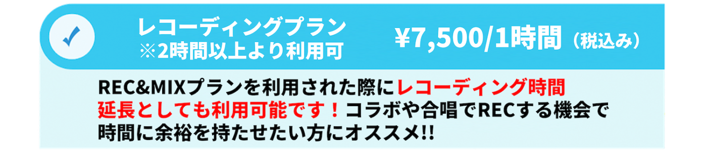 REC基本料金:¥7,500/1H(2時間以上からご予約可能) MIX:¥15,000